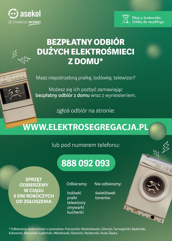 Informujemy Państwa, iż jest możliwy bezpłatny odbiór dużych elektrośmieci bezpośrednio z mieszkań. Usługa dotyczy dużych elektrośmieci (np. pralek, lodówek, zmywarek, telewizorów), ale przy tej okazji może być zabrany również mniejszy sprzęt. W tej sprawie należy skontaktować się z firmą Asekol z którą Wspólnota podpisała umowę pod numerem telefonu 888 092 093.