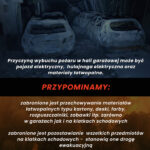 - zabronione jest przechowywanie materiałów łatwopalnych typu kartony, deski, farby, rozpuszczalniki, zabawki itp. zarówno w garażach jak i na klatkach schodowych;