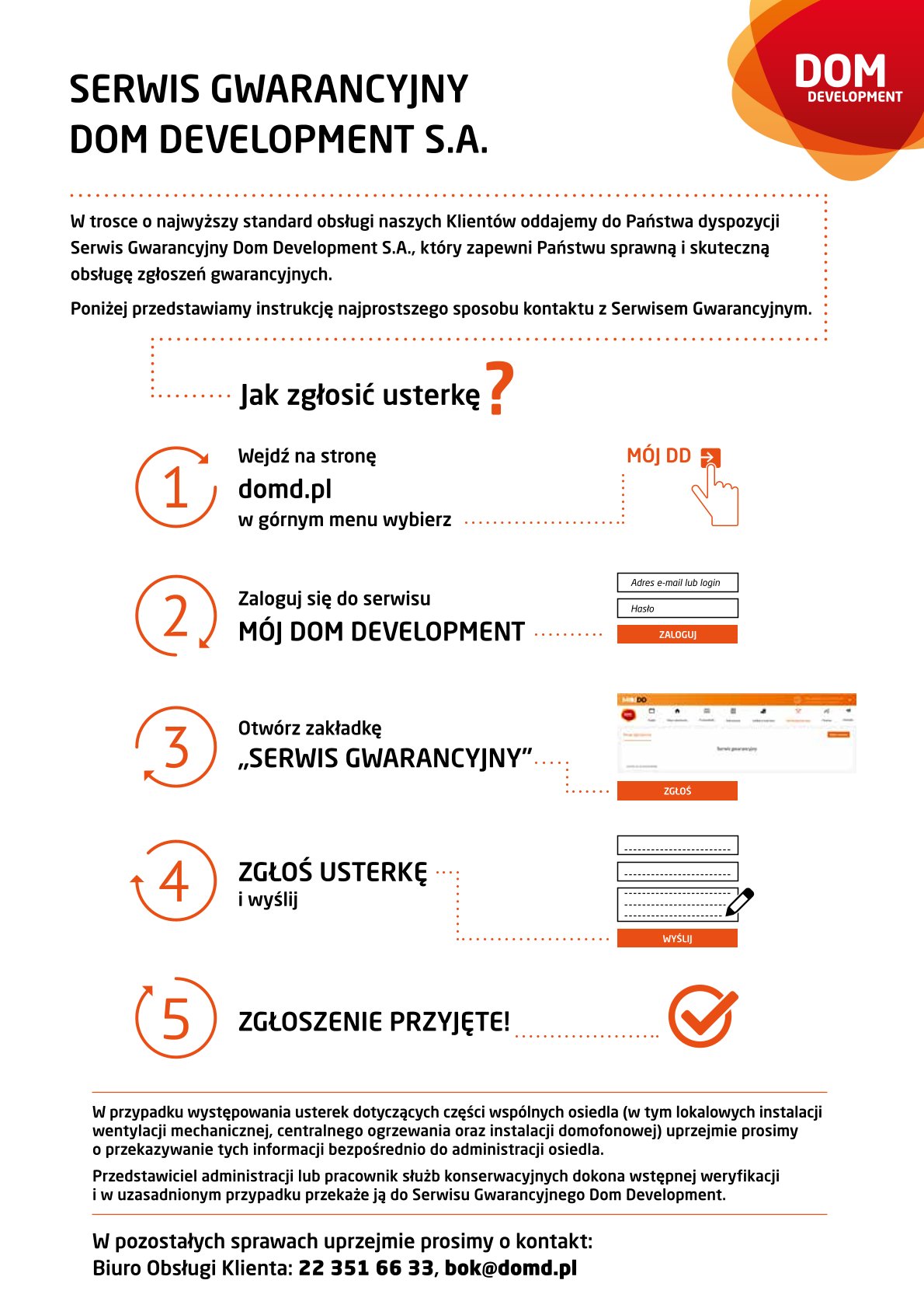 Przypominamy Państwu o sprawdzeniu protokołów odbioru lokali. W 2023 roku, kończy się bowiem okres rękojmi dla II etapu Osiedla. Rękojmia liczona jest w ciągu 5 lat od dnia podpisania protokołu odbioru lokalu. Pęknięcia oraz inne usterki w obrębie lokali mieszkalnych należy zgłaszać do serwisu gwarancyjnego przez aplikację Mój DD.