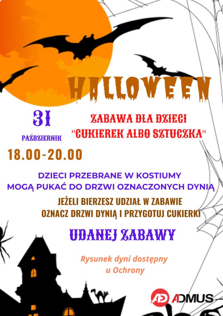 Zachęcamy dzieci do zabawy w dniu 31.10.2022 r. w godzinach 18.00-20.00 „Cukierek albo sztuczka”. Dzieci przebrane w kostiumy, mogą pukać do drzwi oznaczonych dynią. Dzieci, które będą brały udział w zabawie, zapraszamy do pobrania rysunku dyni dostępnego w ochronie. Rysunek dyni, należy powiesić na drzwiach wejściowych. Udanej zabawy.