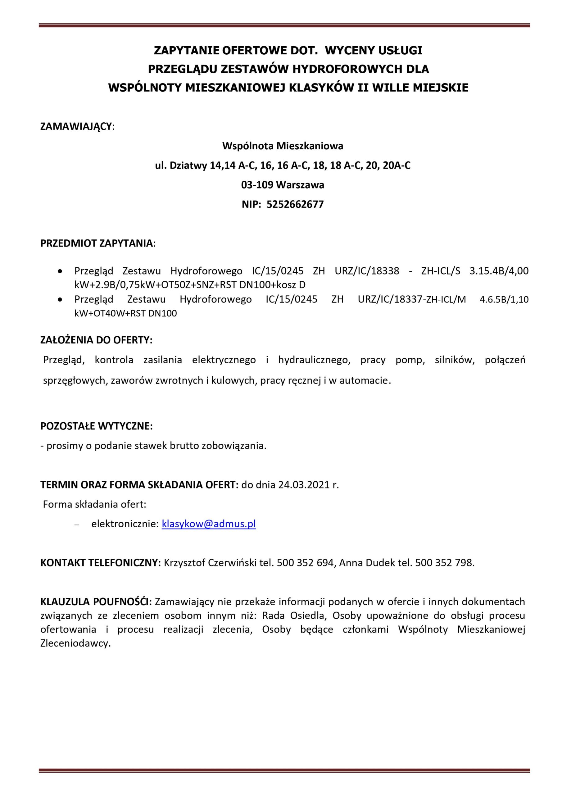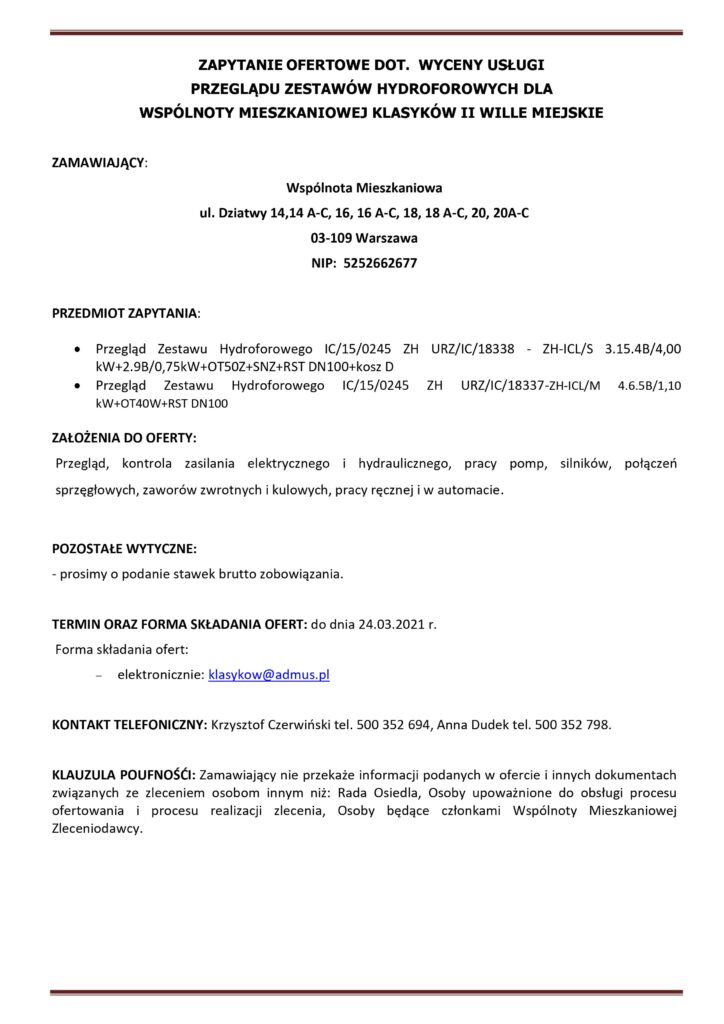 W związku ze zbliżającym się przeglądem zestawów hydroforowych, załączamy Państwu zapytanie ofertowe w tej sprawie. Zachęcamy do złożenia oferty, firmy uprawnione do tego typu przeglądów, bądź przekazania informacji o firmach godnych polecenia. Oferty prosimy kierować na adres klasykow@admus.pl do dnia 24 marca 2021r.
