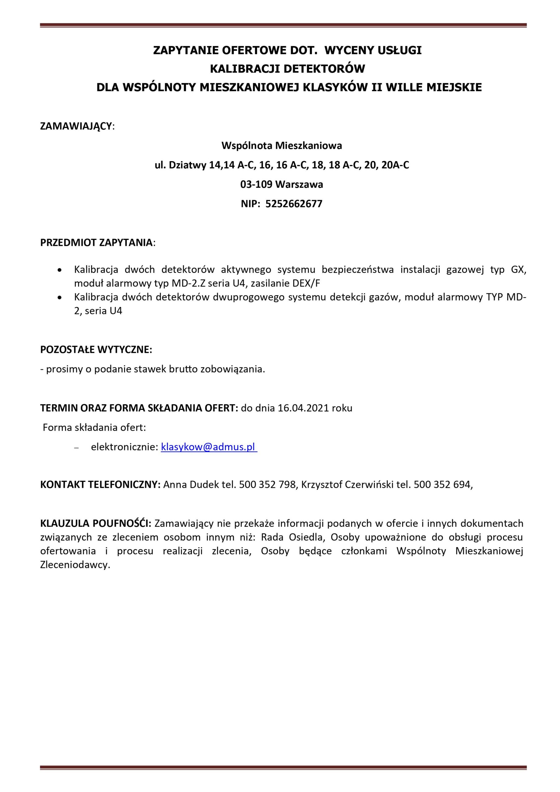 Zachęcamy firmy Podwykonawcze do złożenia oferty na kalibrację detektorów. Oferty prosimy kierować na adres : klasykow@admus.pl do dnia 16 kwietnia 2021 roku.